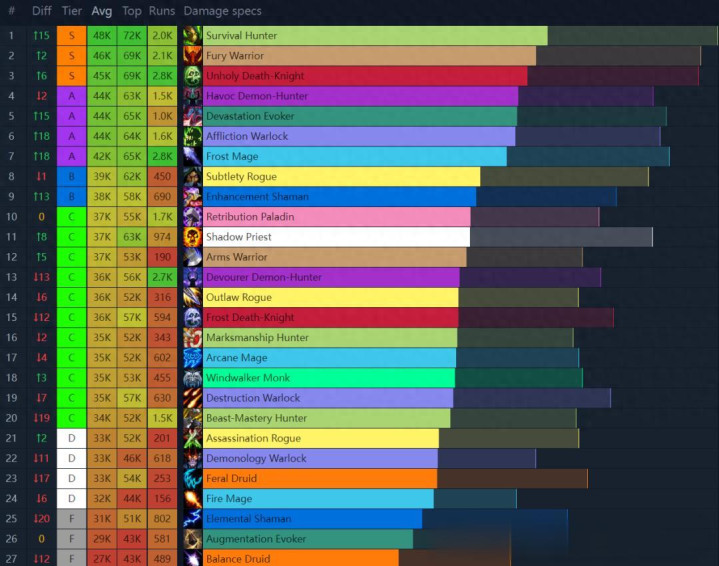 数据来源于Warcraft Logs API。Warcraft Logs 通过将整个大秘境时间内造成的总伤害除以总时间来计算整体 DPS,包括非战斗时段的时间。这与游戏内的插件(如 Details)有所不同,后者通常会显示更高的 DPS 值,但是这样的好处是可以平均的了解一个职业的平均水平,而不局限于任意副本。